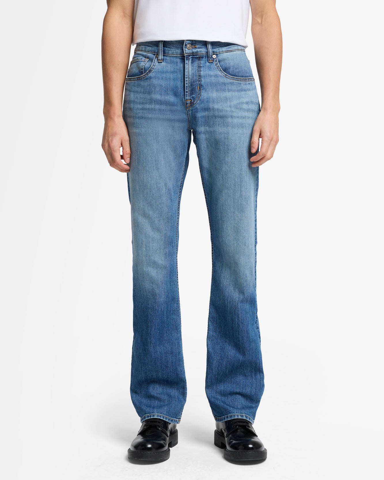 Looks like:A medium blue wash, bootcut jean with a relaxed fit that’s perfectly balanced—never oversized.